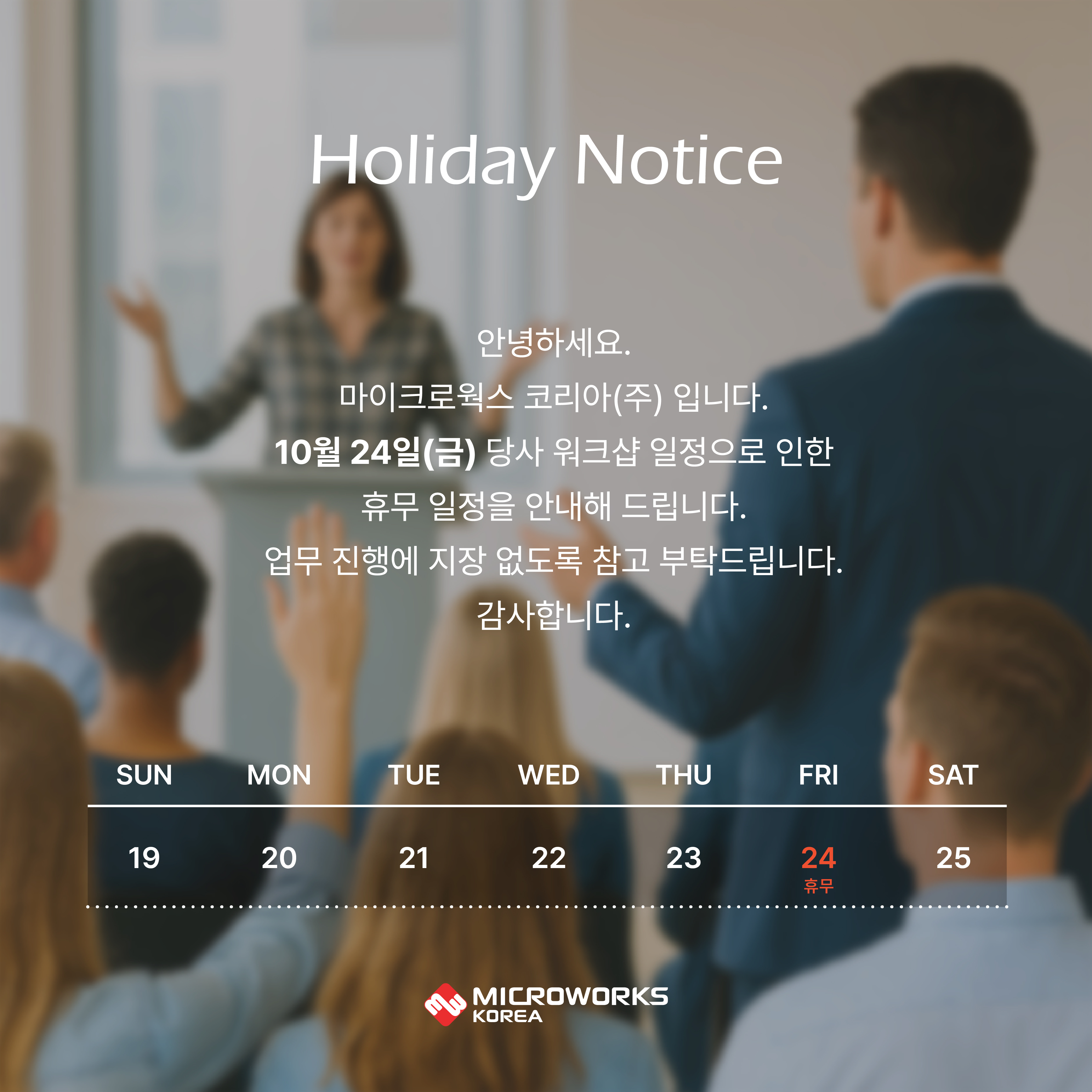 | 11월 휴무일정 안내해드립니다. | 마이크로웍스 코리아(주) (0) | 2025.11.10 |